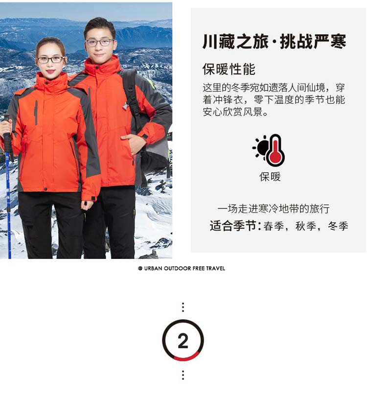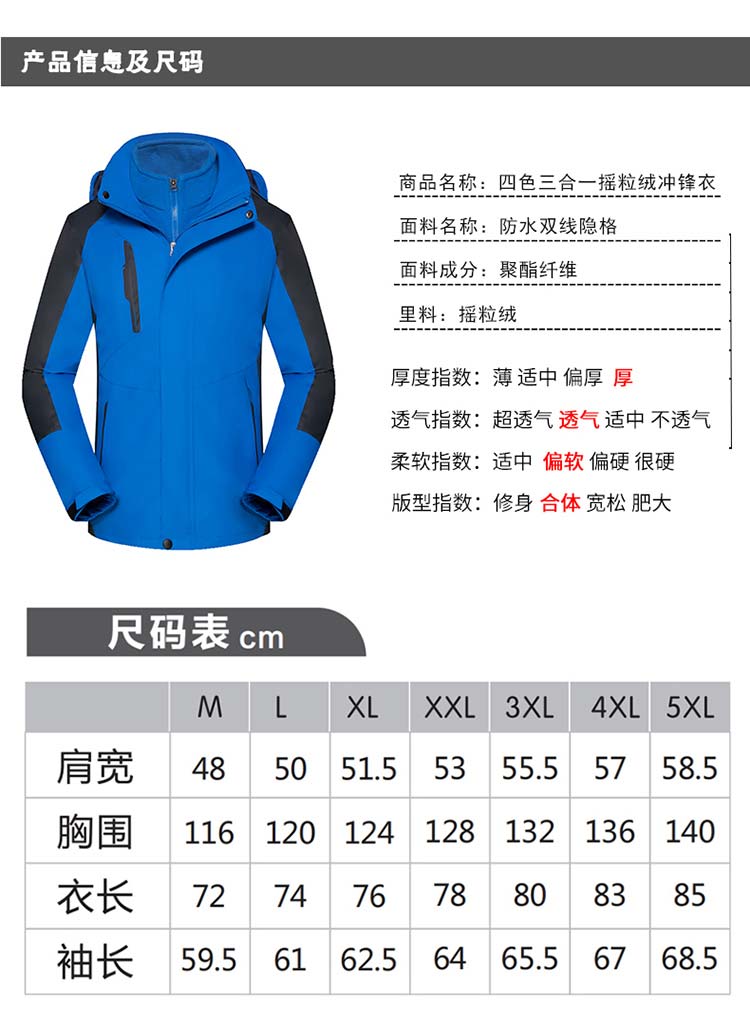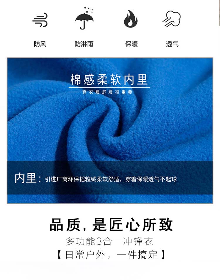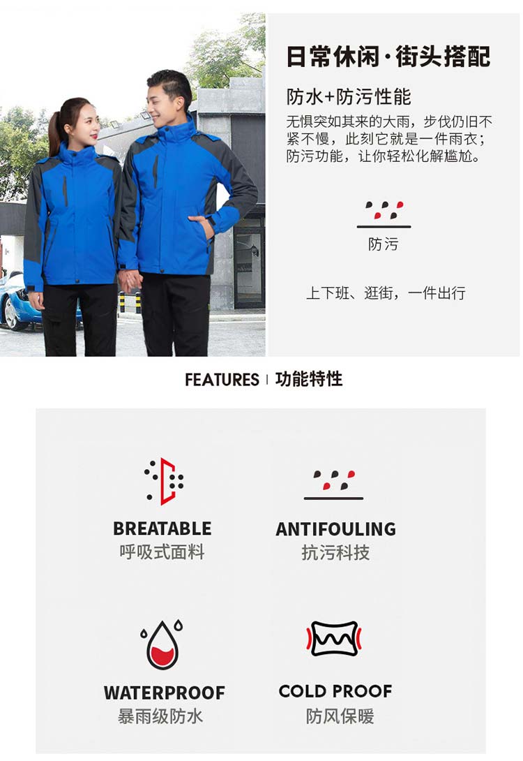 特性:防風防水防污防寒三合一套沖鋒衣,可拆卸